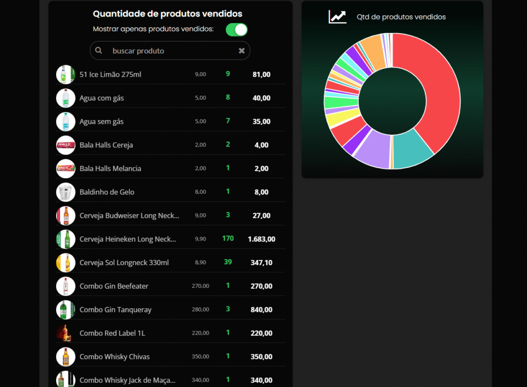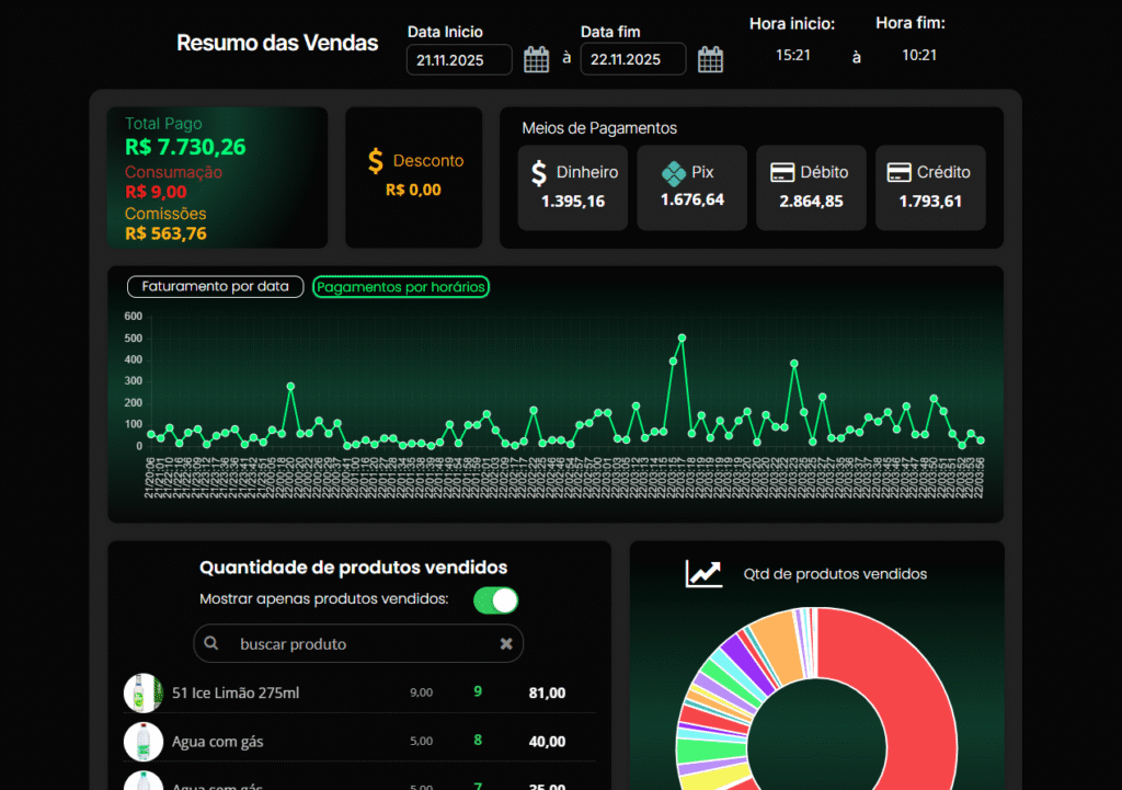 Relatórios de vendas detalhados com filtro por data e hora, exibindo cada item vendido no período, volumes, valores e desempenho completo das vendas.
